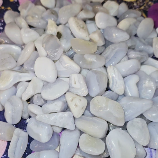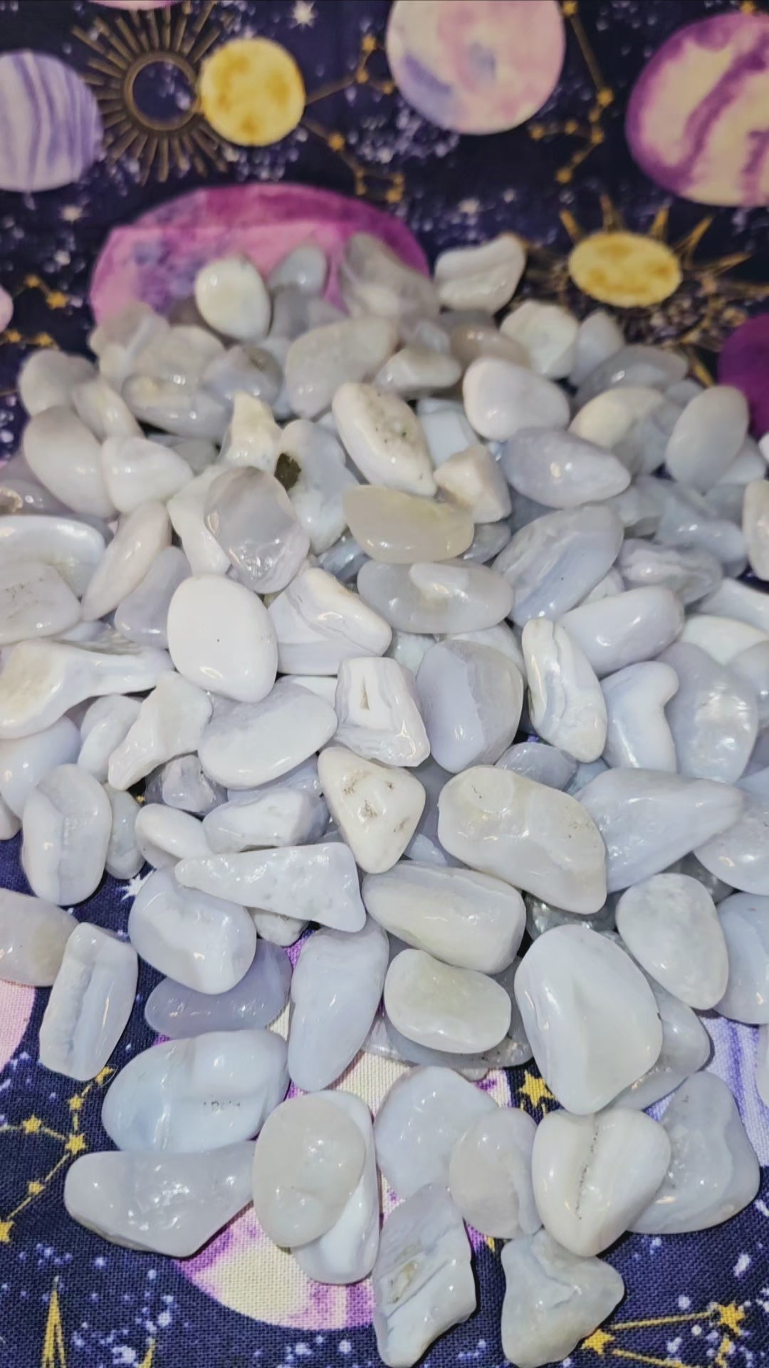Blue Lace Agate is a light blue stone with shades of white swirling throughout. It helps to ward off the Evil Eye, release mental stress, neutralize feelings of anger or fear, and promote mental clarity.