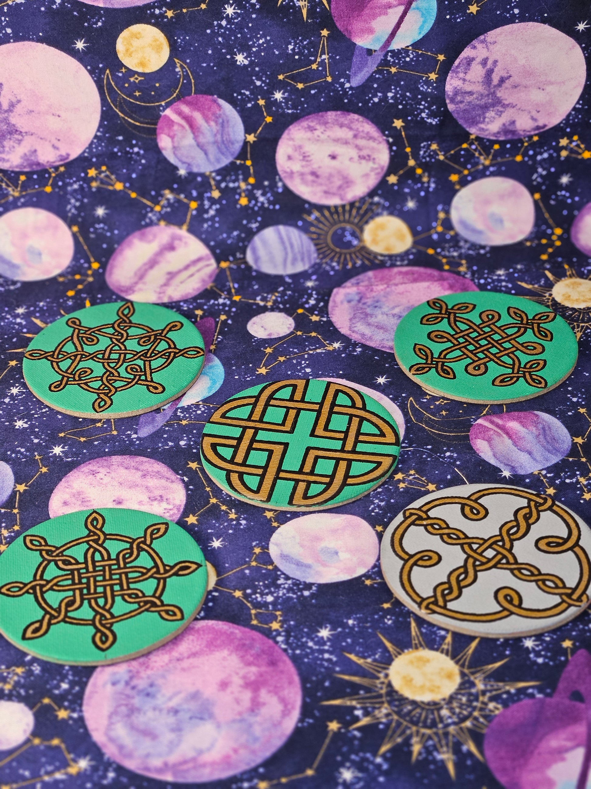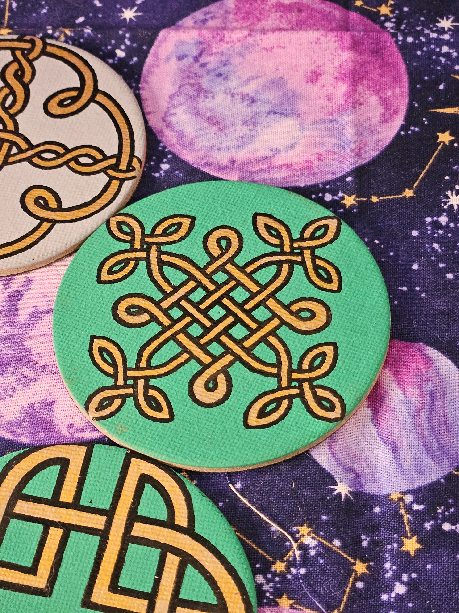 The art of cletic knotwork is mesnt to symbolize eternity and the interconnectedness of life. This piece is inspired by celtic brooch jewelry. It's painted with gold line work and green background, both traditional celtic colors. This set of designs is my way to pay tribute to my Irish and Scottish heritage. I've always found celtic knotwork extremely enchanting and this design looks like the fancy broaches my maternal grandmother use to wear.