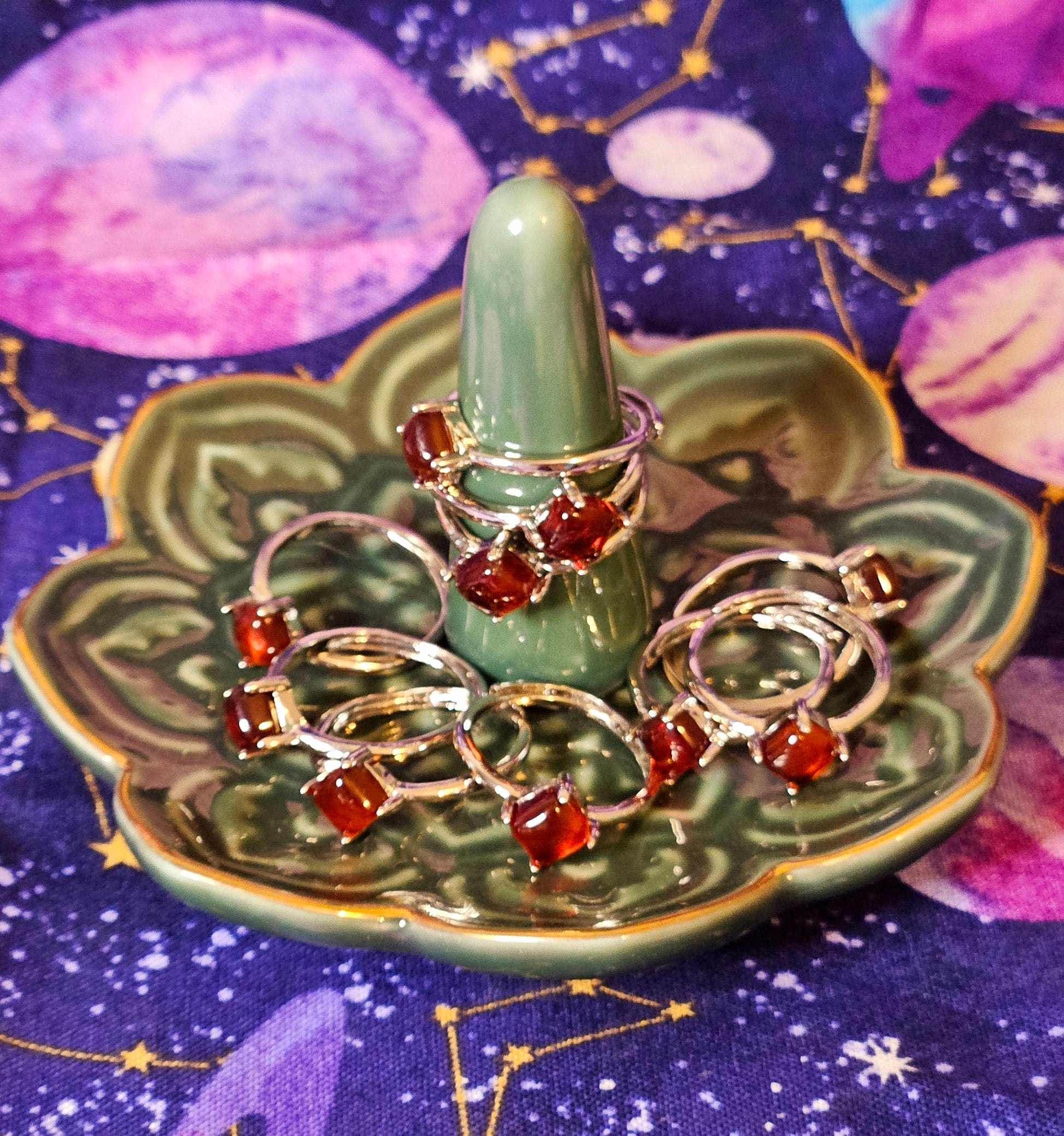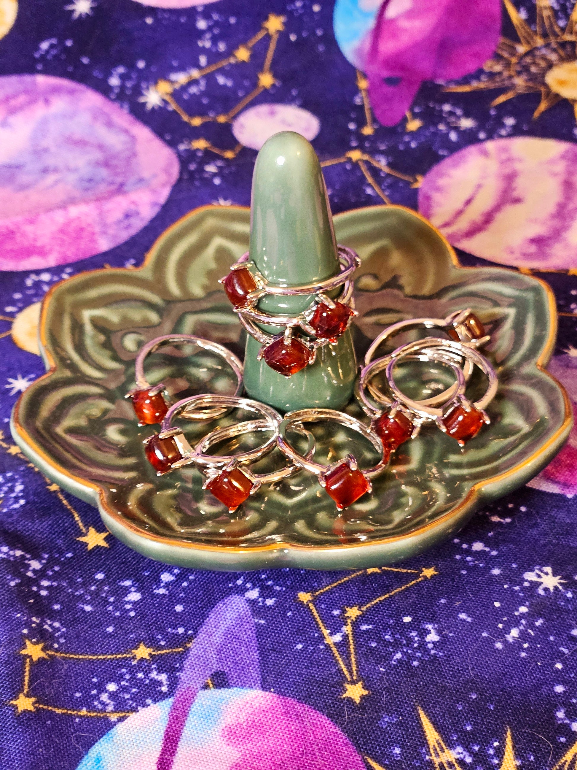 This fiery garnet rhombus adjustable ring promotes love, friendship, and helps heal broken bonds. Associated with the root and sacral chakras, it's beneficial for both protection and passion.