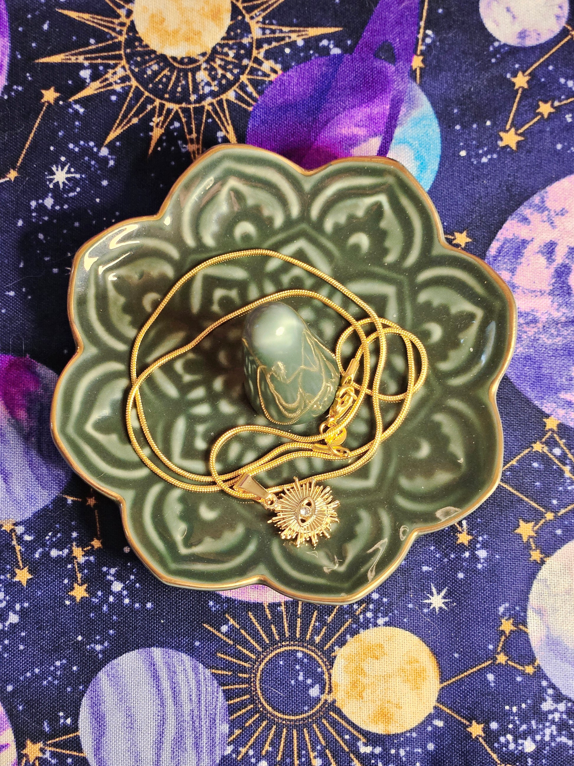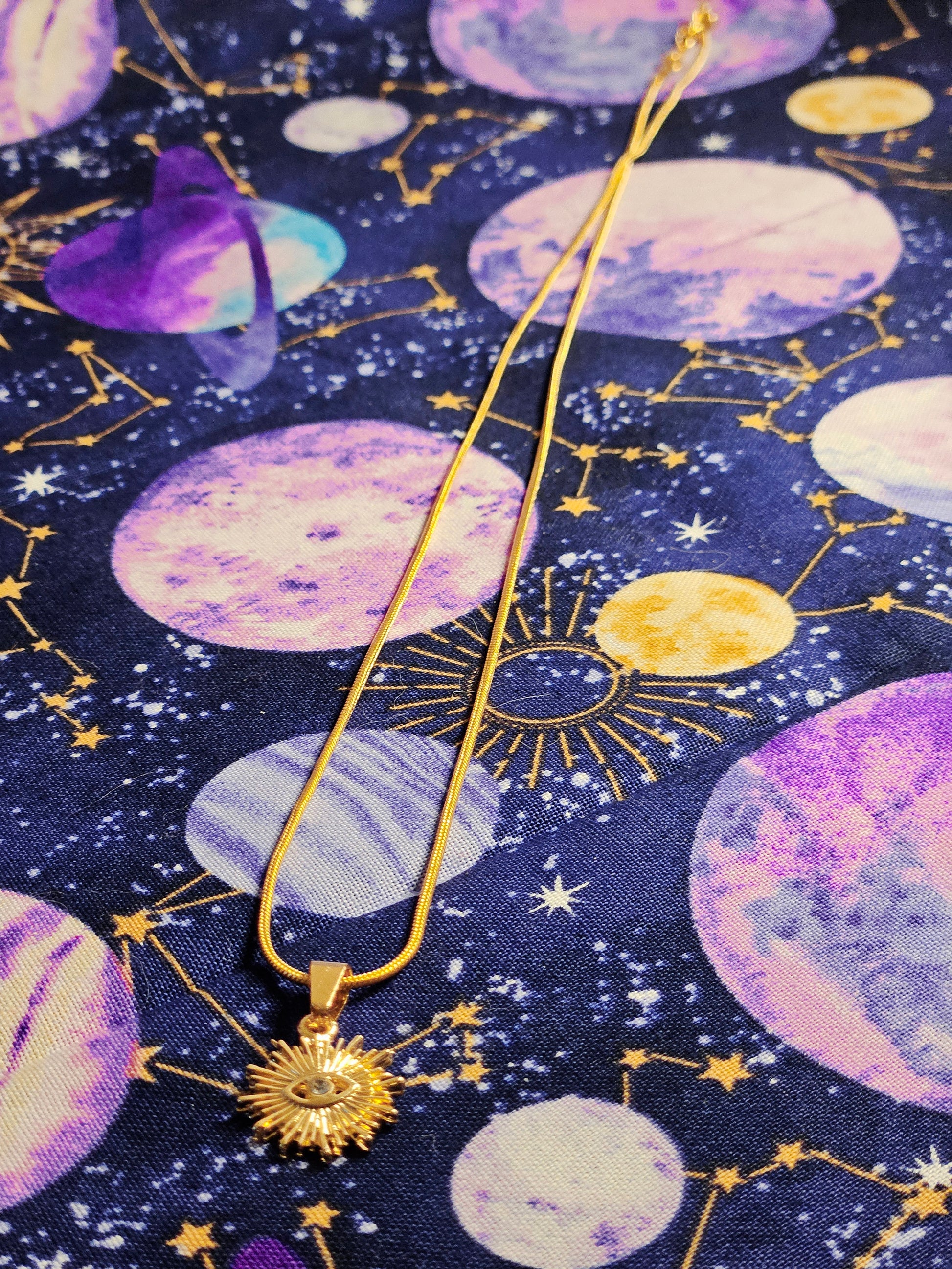 In many cultures and religions, this pendant is worn to protect themselves from the "Evil Eye", which is the malevolent gaze of others who are envious of you and wish you harm. It's made of gold-- a symbol of the divine, enlightenment, and spiritual transformation. Wear this to ward off evil intentions and connect with the divine in your life.