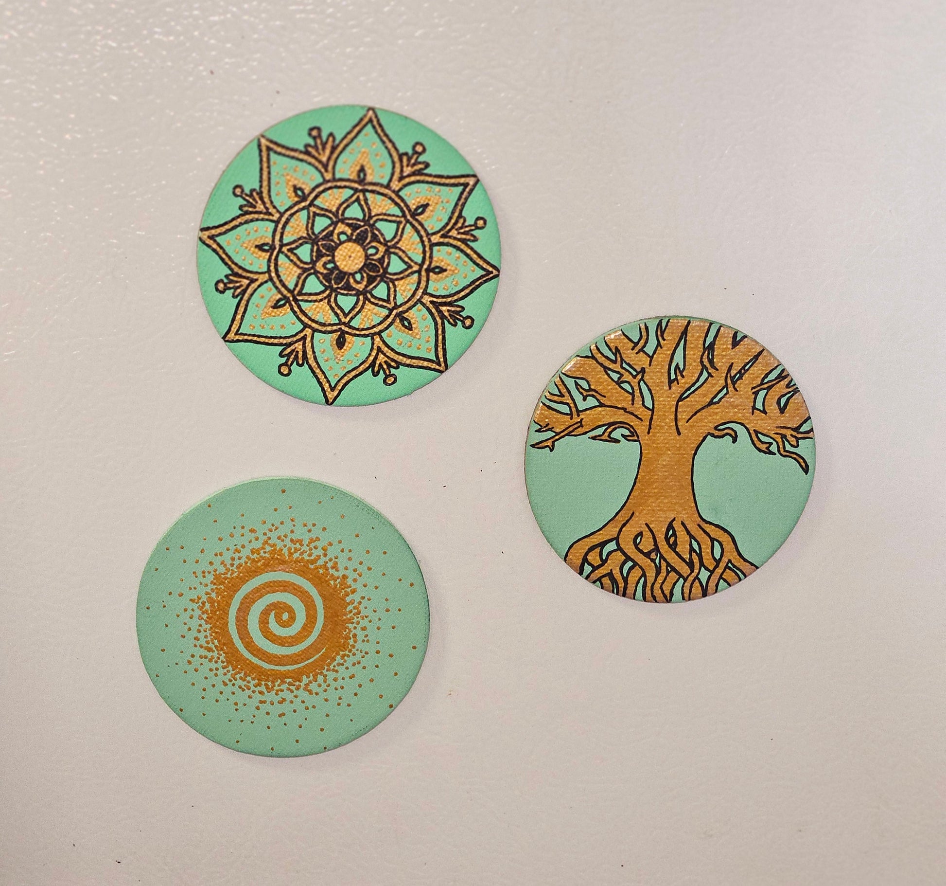 Hand painted magnets are a great way to add art and soul to your home without needing to have a large open space or put any holes in the wall. Place this in your kitchen, on the side of a metal desk or bookcase, or up on any magnetic surface to admire its golden beauty.