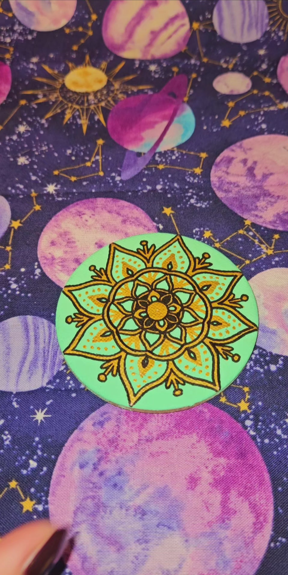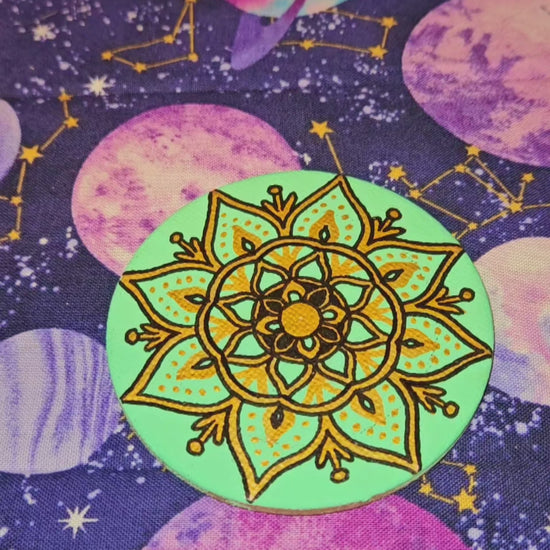 Mandalas are symmetrical patterns that are believed to aid people along the path to enlightenment. This mandala features gold accents with a floral inspired design. The background is a soft, pastel green to promote relaxation. The word "mandala" means "circle" or "whole world" in Sanskrit, and the design represents the entire universe and the cyclical nature of life.