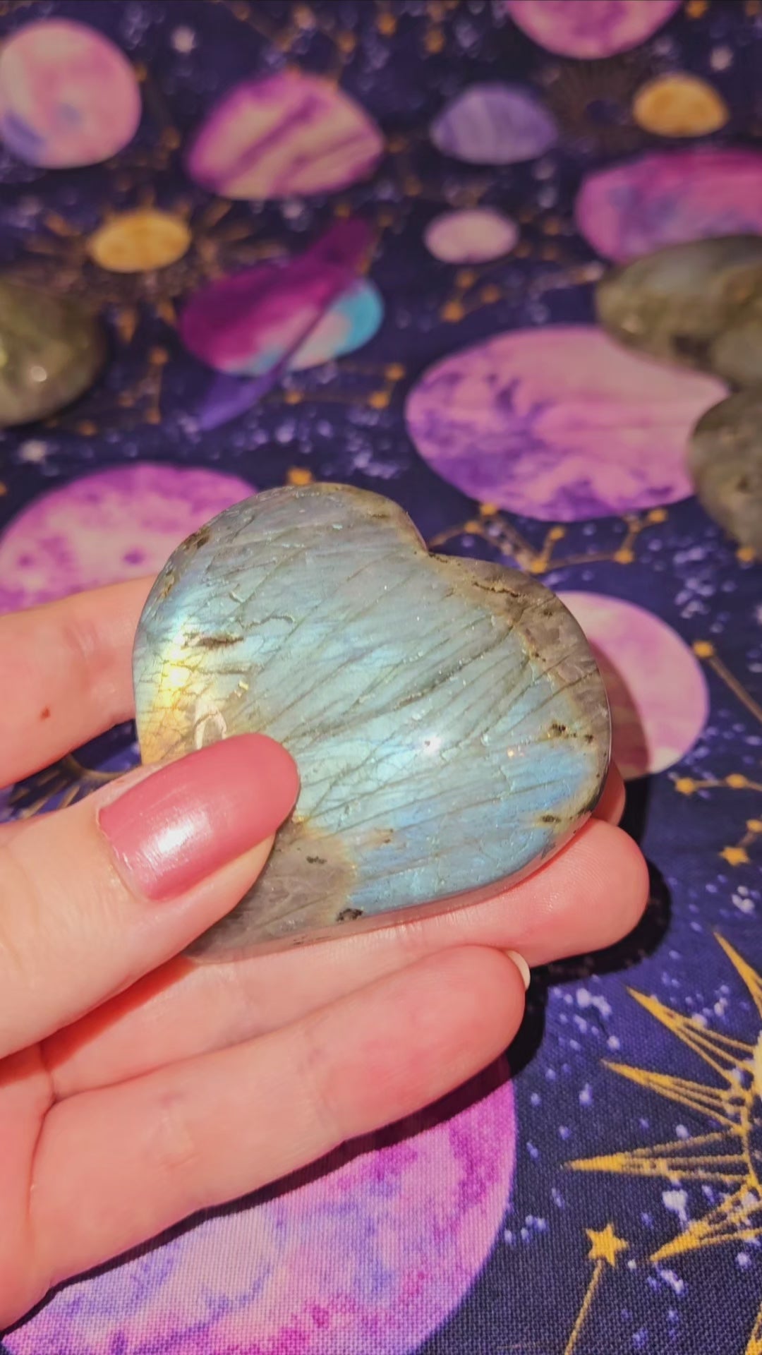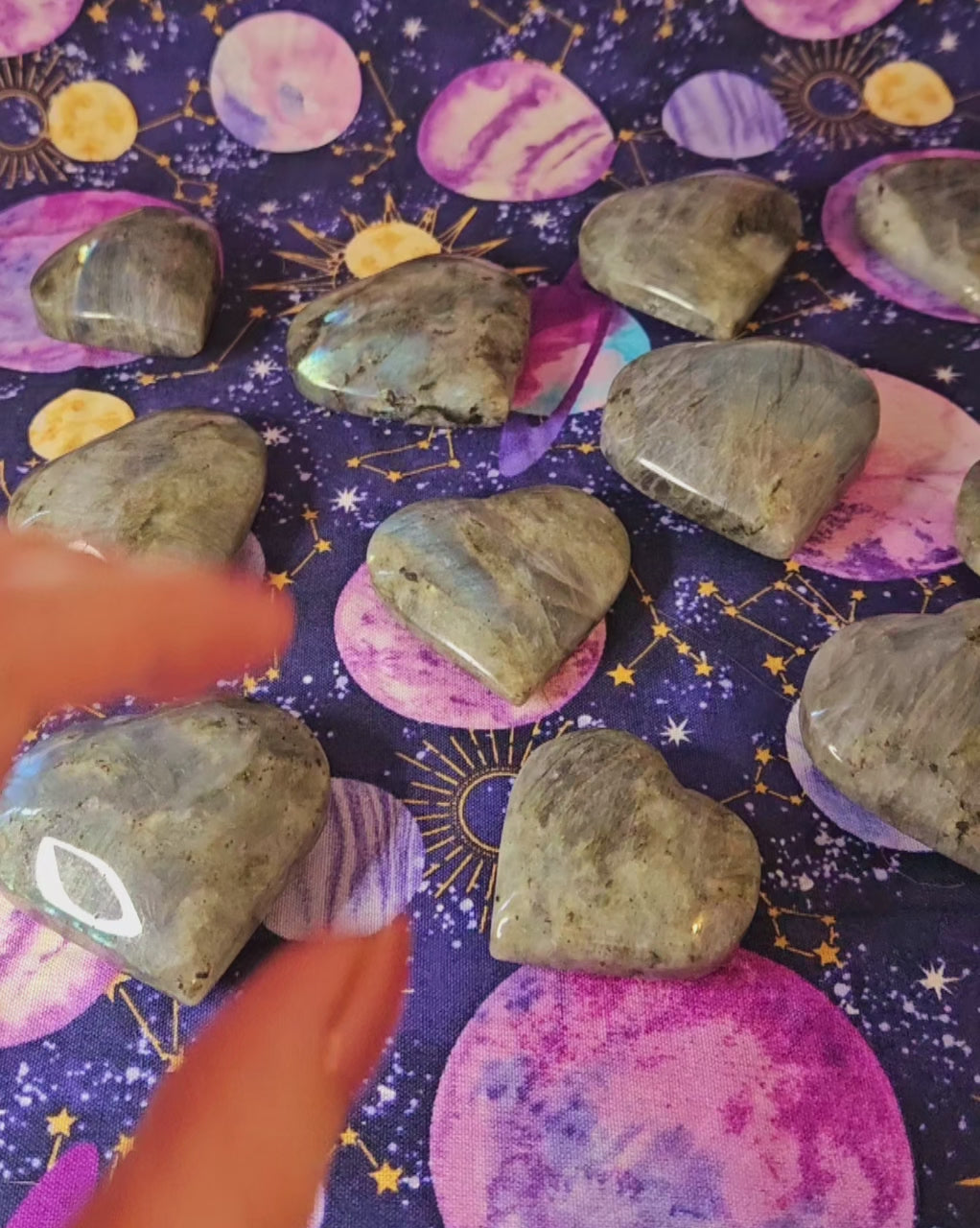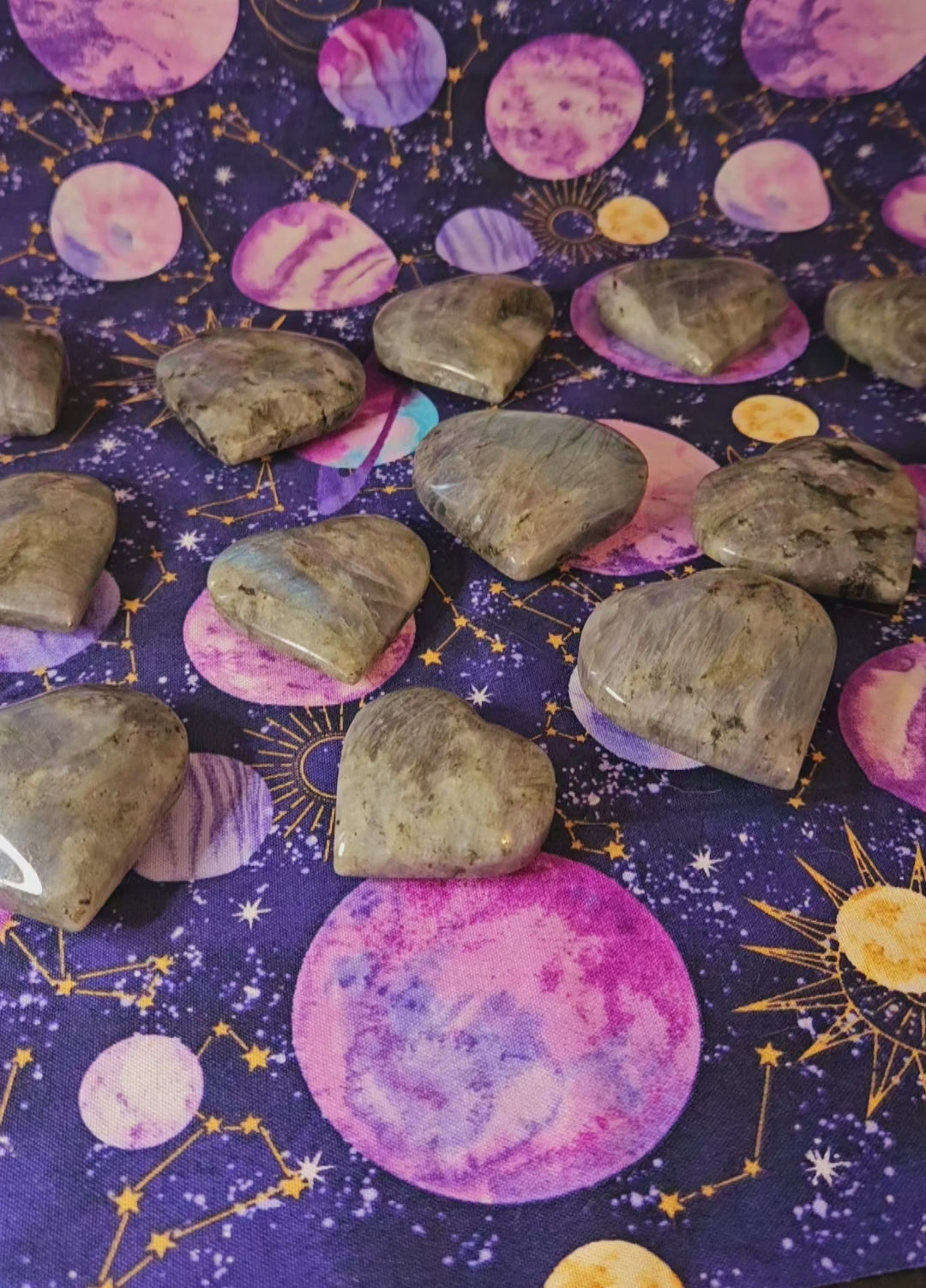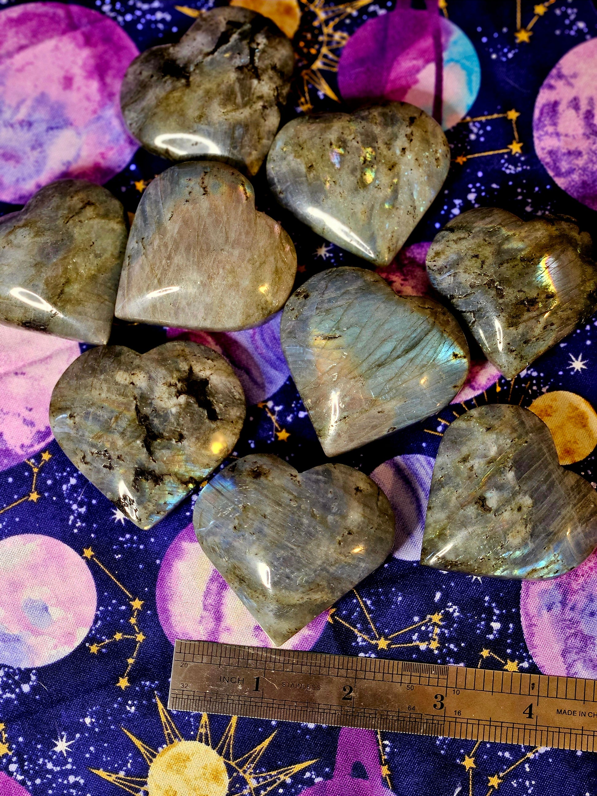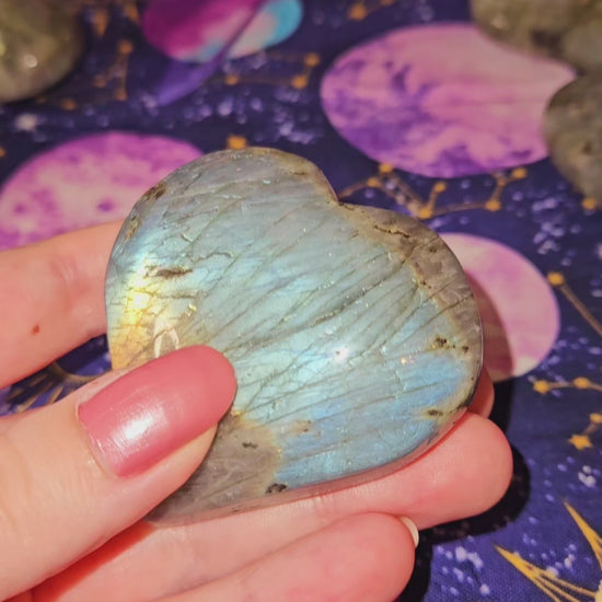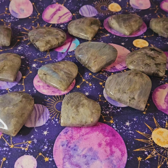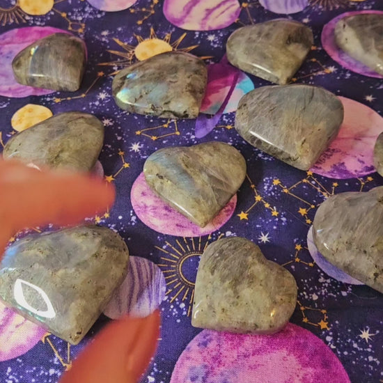 These shimmering labradorite stones have been carved into beautiful hearts. Just like with love, no two are exactly alike-- each has its own flares of captivating color that make it unique.