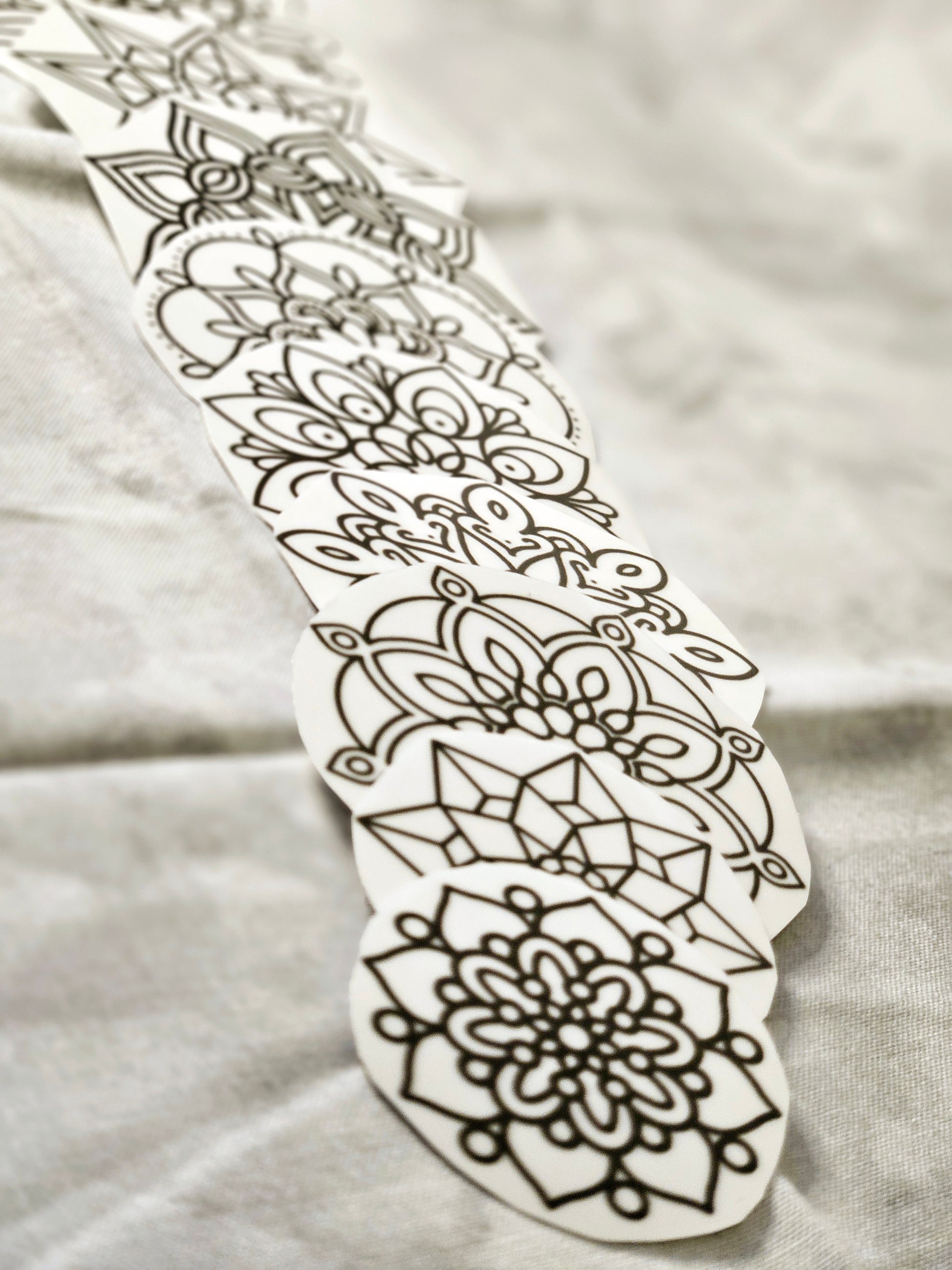 This mandala based clear decal collection can be easily placed on and removed from nearly any surface! Since they can be placed almost anywhere, they are an ideal way to create a sacred space anywhere you go. They can be placed on walls, binders, waterbottles, dressers, mirrors, and phone cases are just a few of the places you encounter or carry daily that they can be placed on to add extra zen wherever you are.