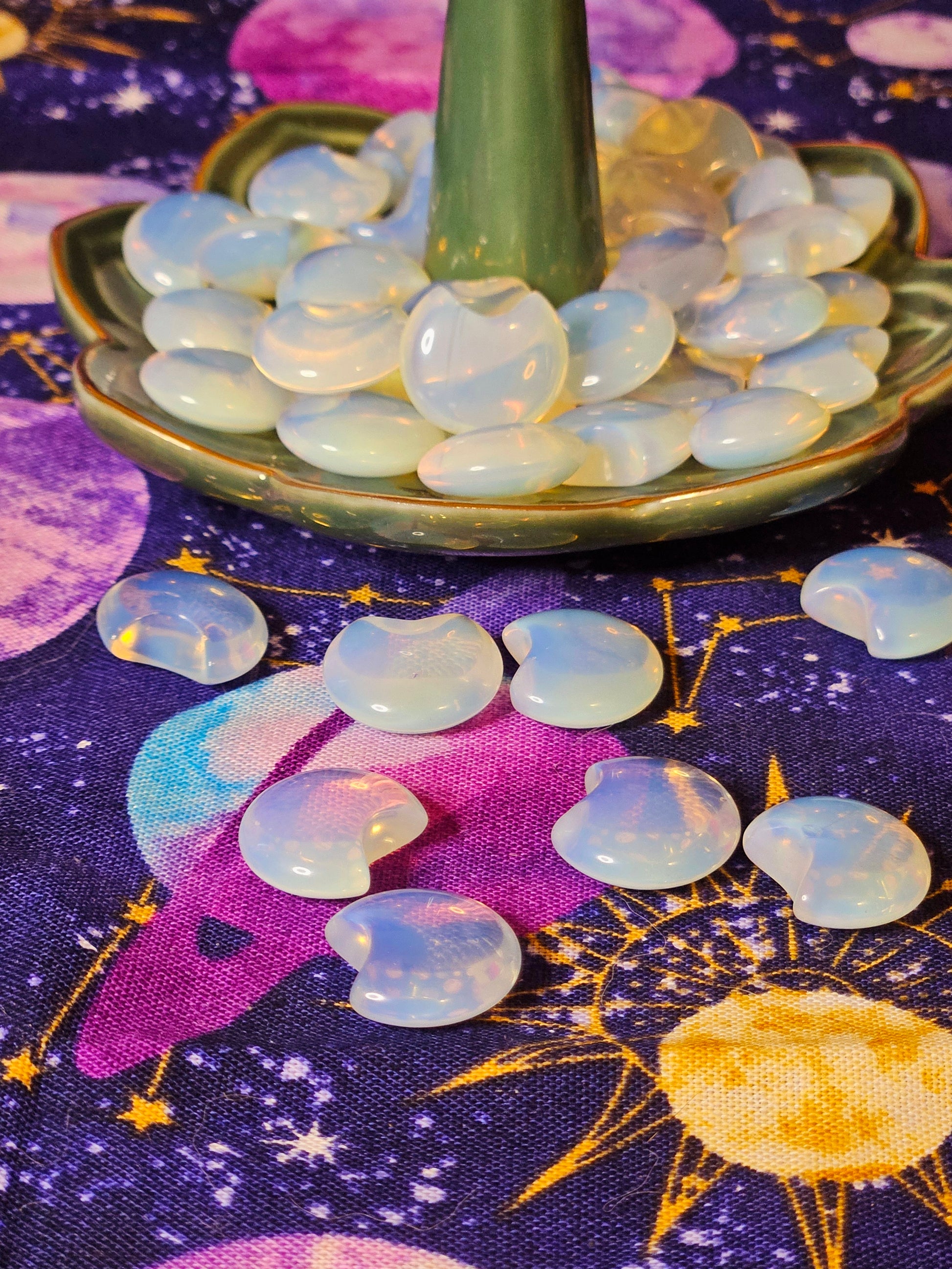 This iridescent Opalite Moon pocket stone glows with a celestial brilliance reminiscent of the real Moon.