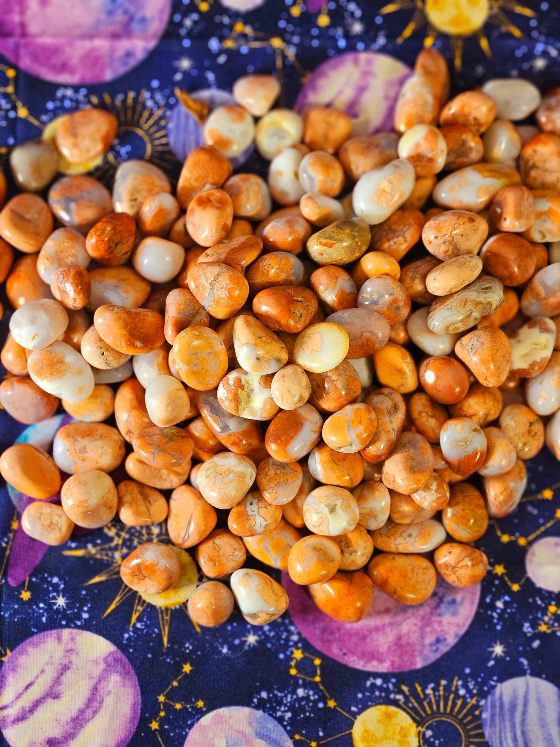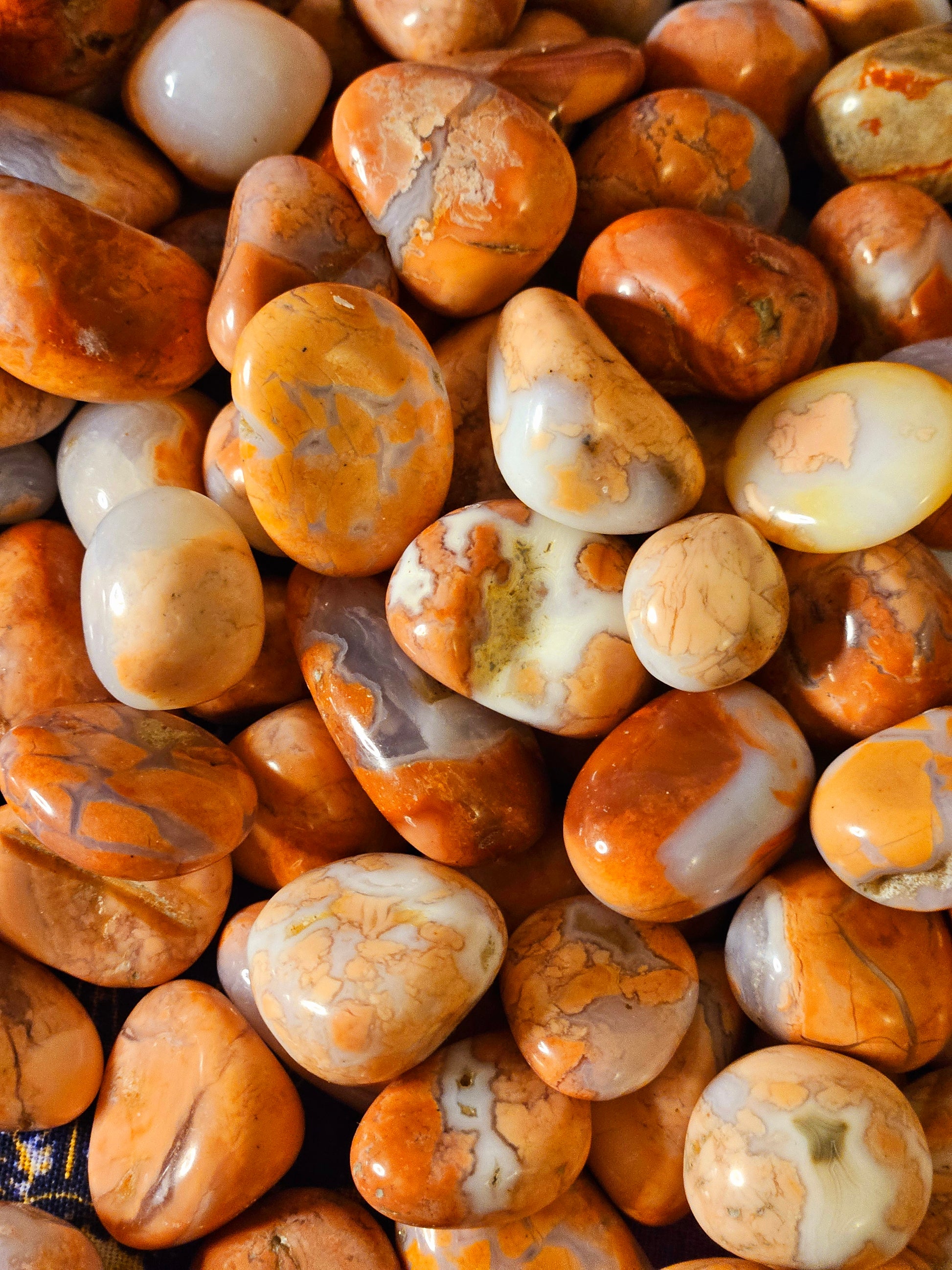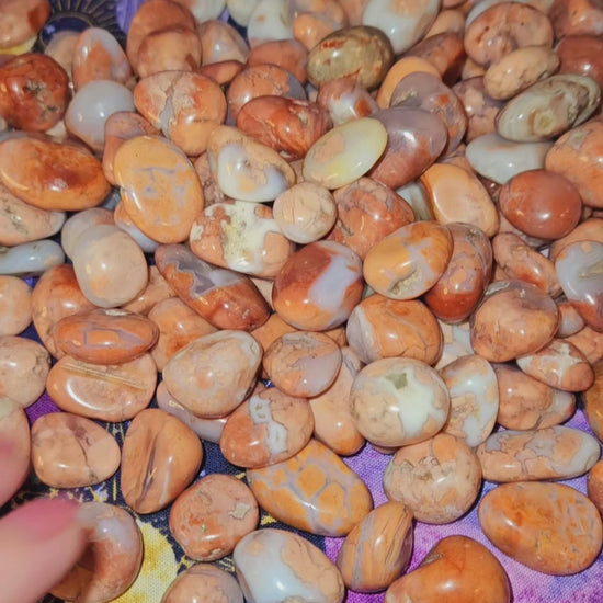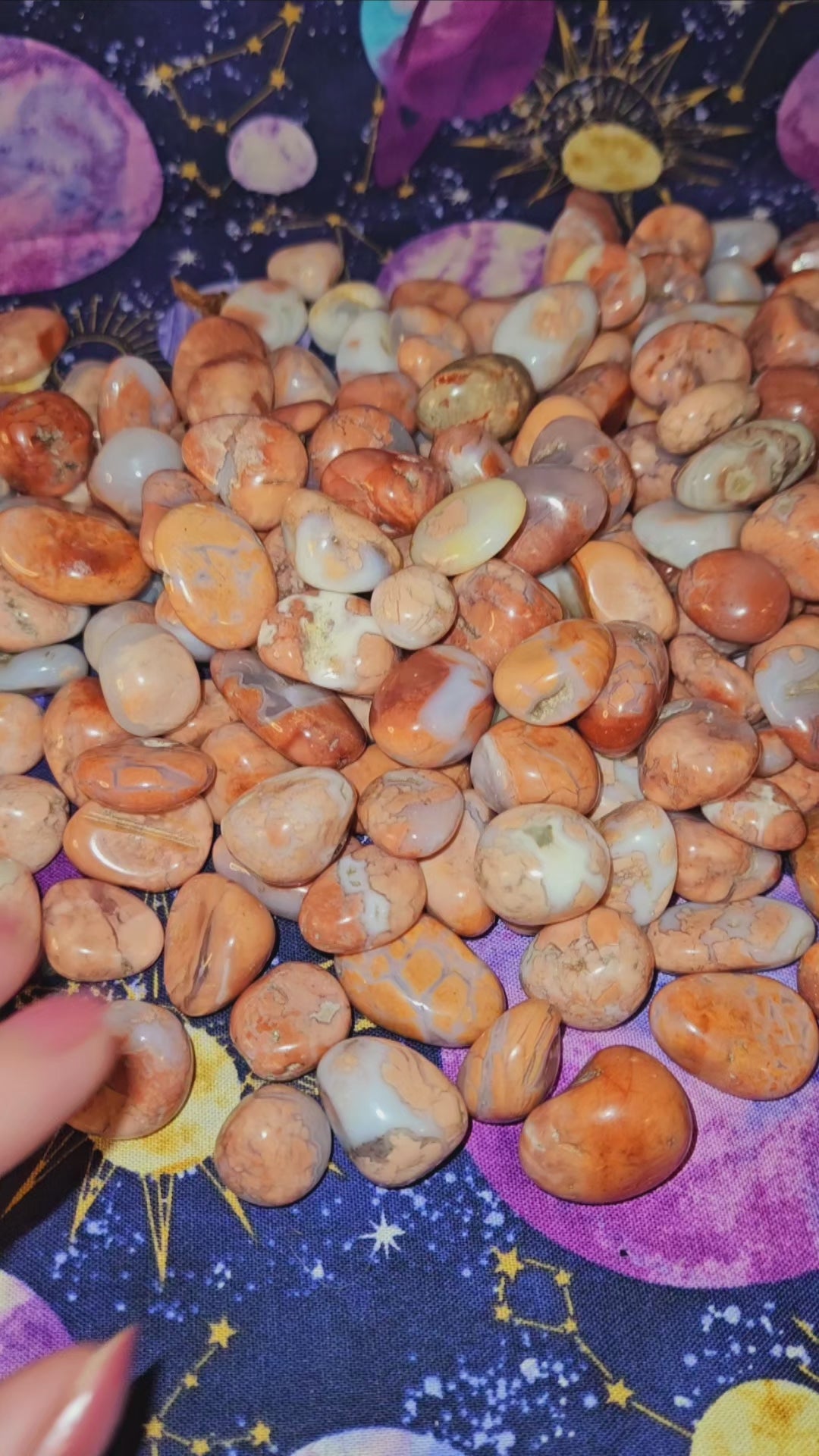 Pink Sakura Agate is a healing stone. Its energetic properties support self-confidence, concentration, and essentially "reblooming" after feelings of loss or grief. They have beautiful spots and swirls that make each piece beautifully unique.