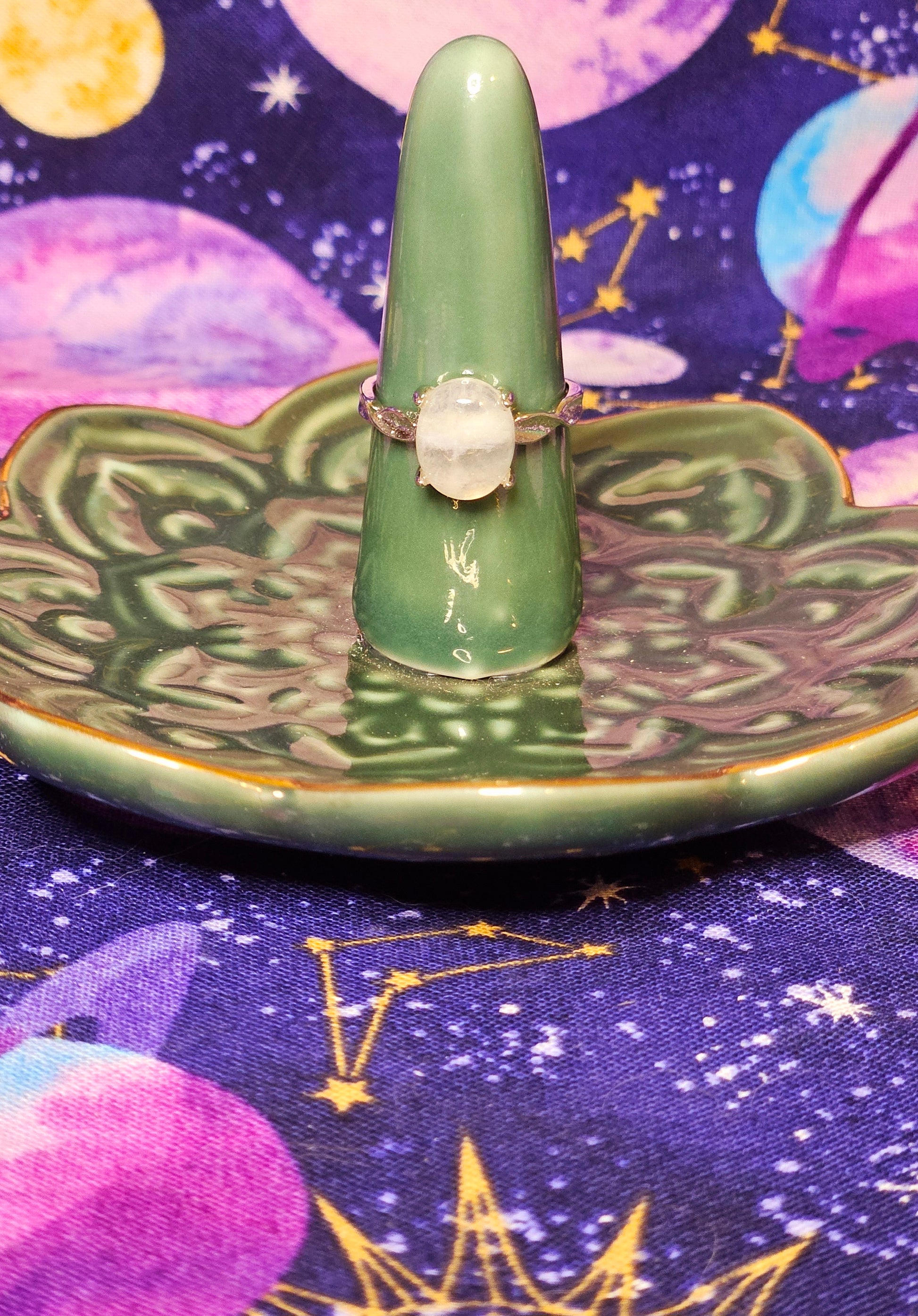 This ring displays a beautiful, iridescent Sri Lanka moonstone with twisted, adjustable band design. Associated with the crown chakra, moonstone is known as the Stone of Emotions. It promotes emotional balance, frees tension, brings happiness, and represents the divine feminine. It's is great for helping to calm emotions into a state of serenity or balance out yin energy.