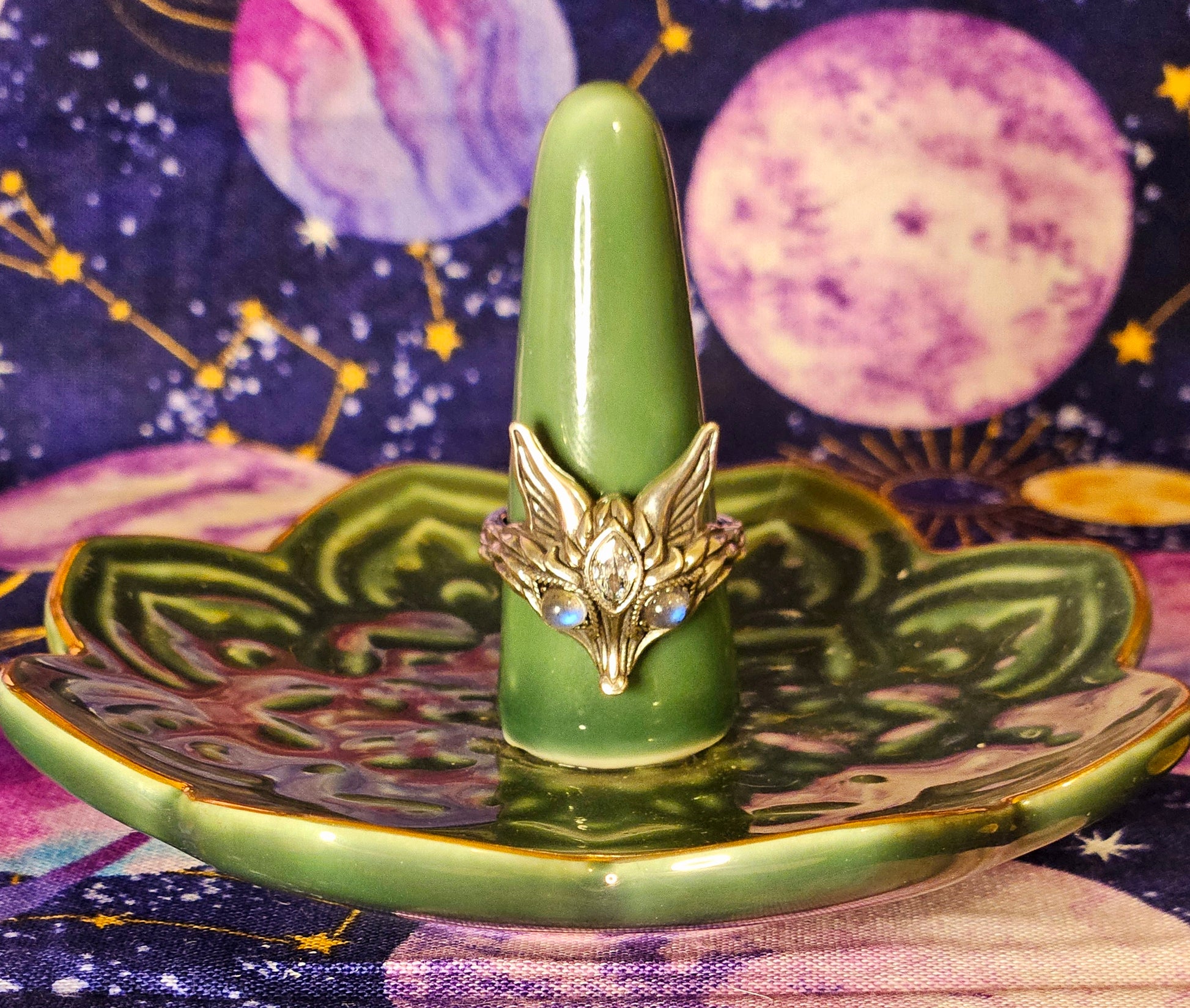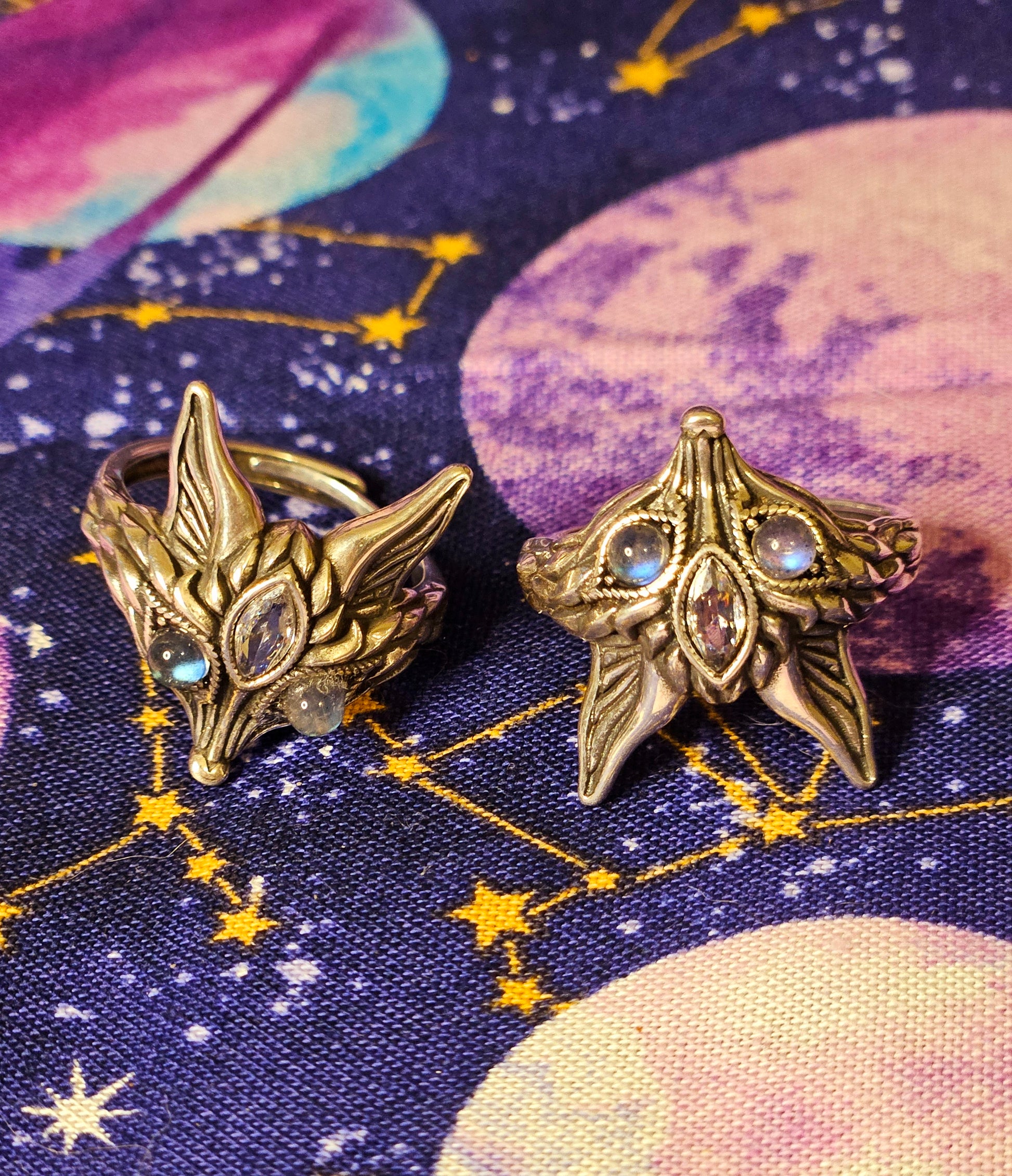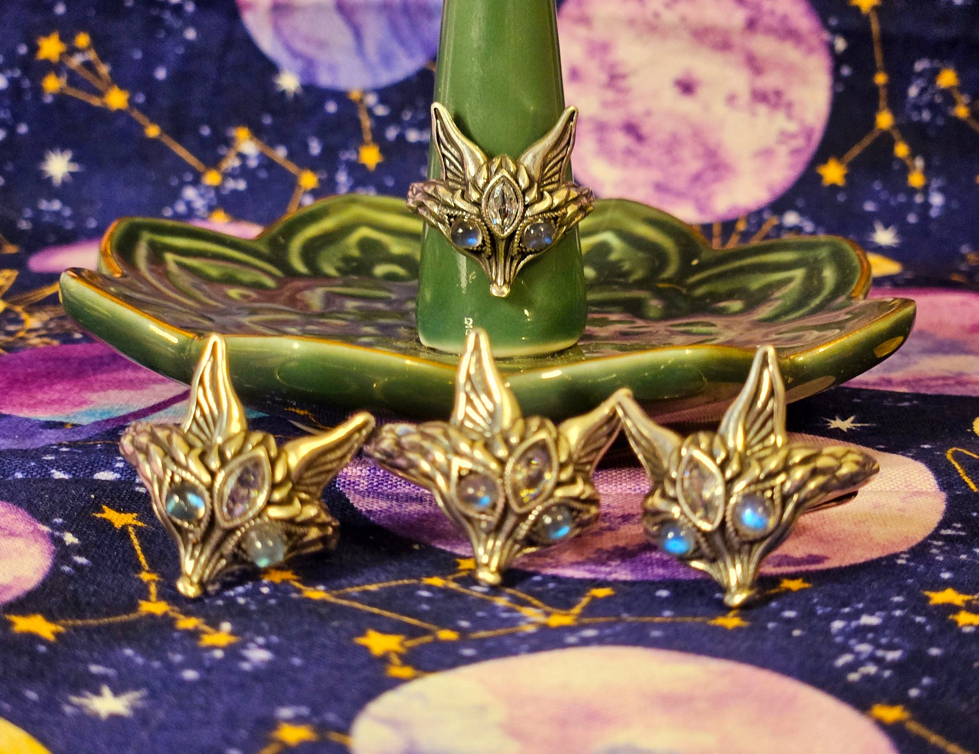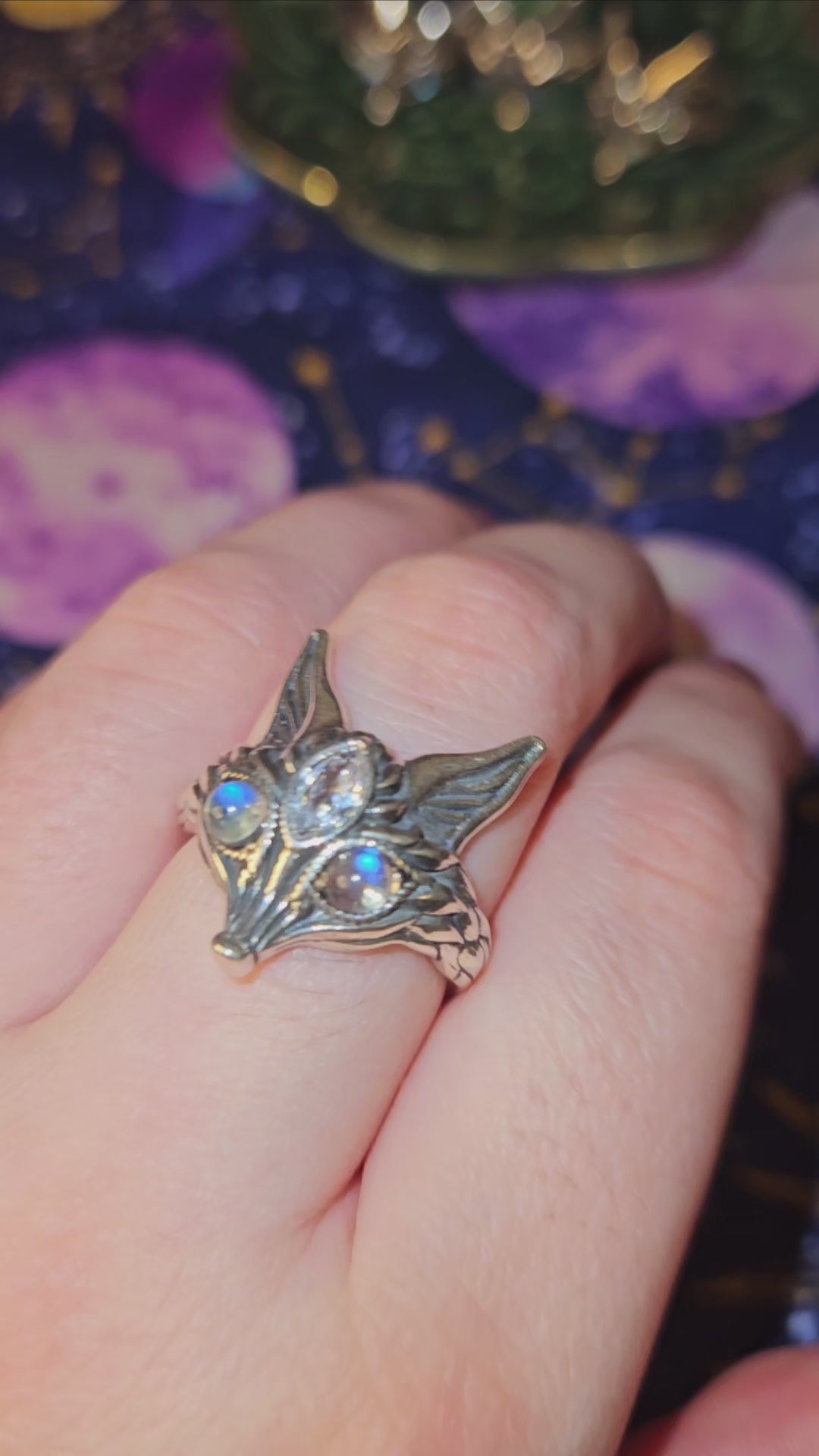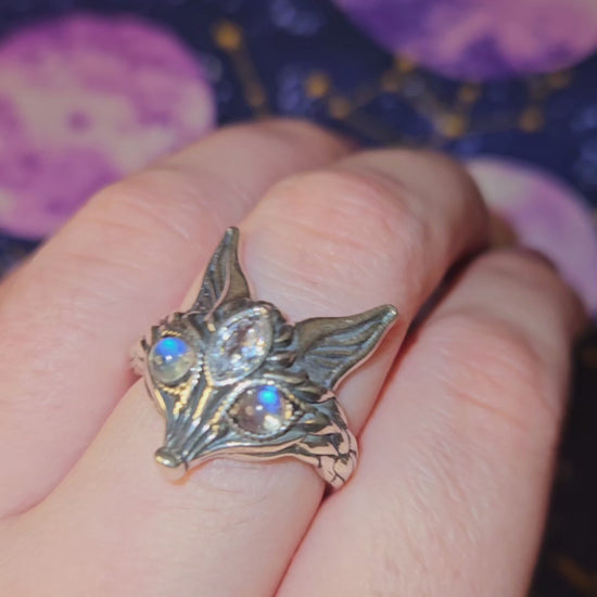 This stunning unique fox ring is made out of pure 925 Sterling Silver with flashing Labradorite eyes and a Clear Quartz third eye.